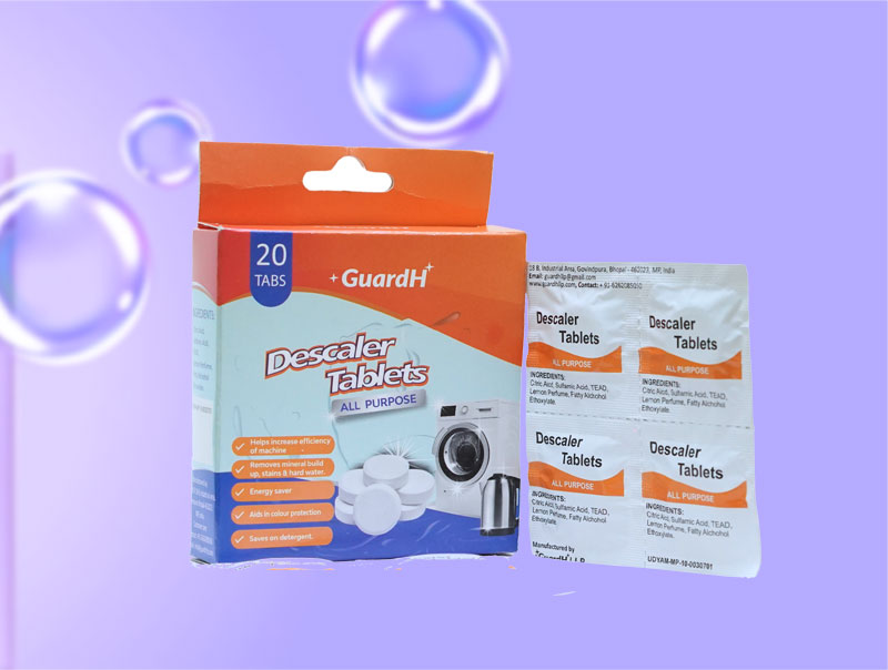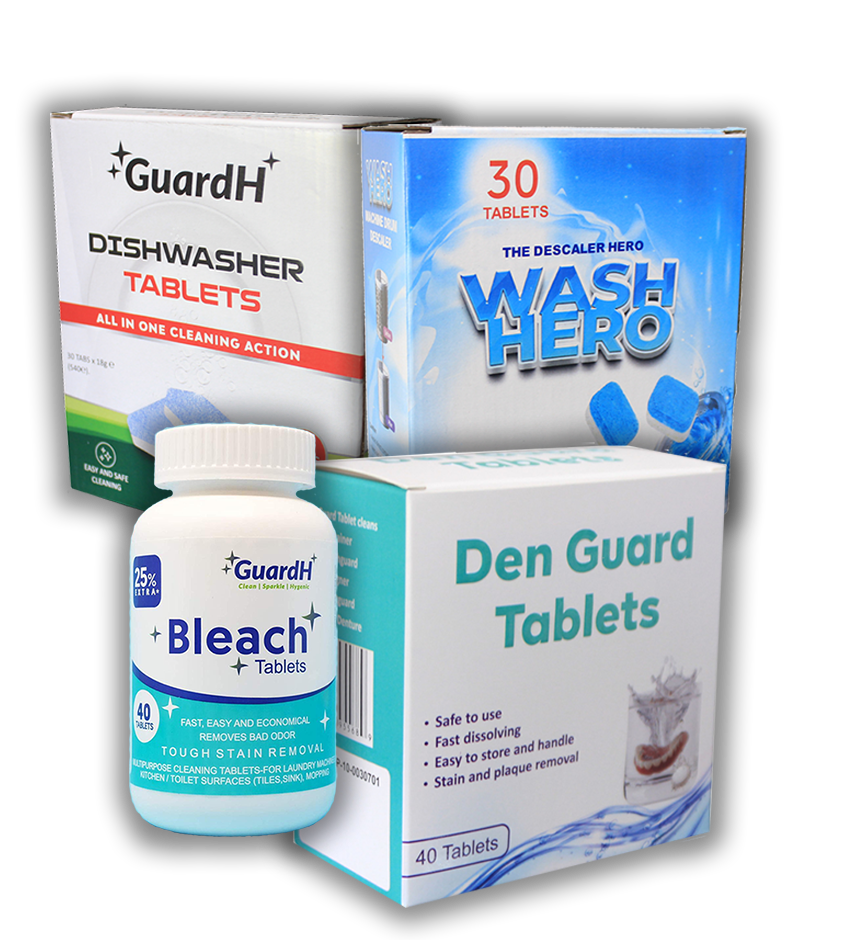 GuardH LLP offering a wide range of solutions, including bleach tablets, dishwasher tablets, washing machine cleaning tablets, descaler tablets, denture cleaning tablets, glass cleaning tablets, coffee machine cleaning tablets, limescale remover tablets and humidifier cleaning tablets.
